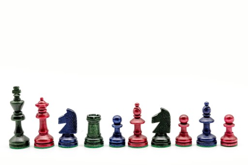 Komplet stanowi kaseta z planszą szachową, zestaw figur szachowych w kolorach wiśniowym, zielonym i niebieskim po 16 elementów w każdym oraz wielojęzyczna instrukcja.