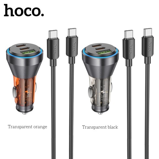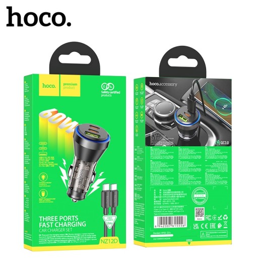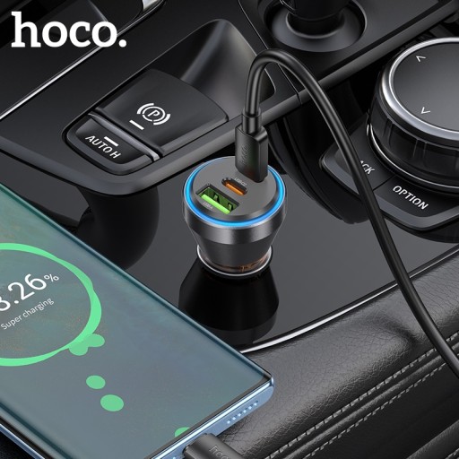 hoco NZ12D Lucky to szybka, mocna ładowarka samochodowa z trzema złączami wyjściowymi, dwoma w standardzie USB Typ / Typu C / USB-C / Type-C o mocy 30W maksymalnie i jednym w standardzie USB-A o mocy maksymalnej 18W. Moc maksymalna łączna ładowarki przy użyciu wszystkich złączy wyjściowych i ładowaniu trzech urządzeń jednocześnie to 45W. Natomiast przy korzystaniu z dwóch dostępnych złączy USB Typ C to 60W. Ładowarka posiada dodatkowo wszelkie zabezpieczenia prądowe i przepięciowe oraz certyfikaty dopuszczające do sprzedaży i użytkowania na terenie Unii Europejskiej. Długość kabla dostepnego wraz z ładowarka to ok. 1M / 100 cm. Ładowarka posiada podświetlenie sygnalizacyjne LED.