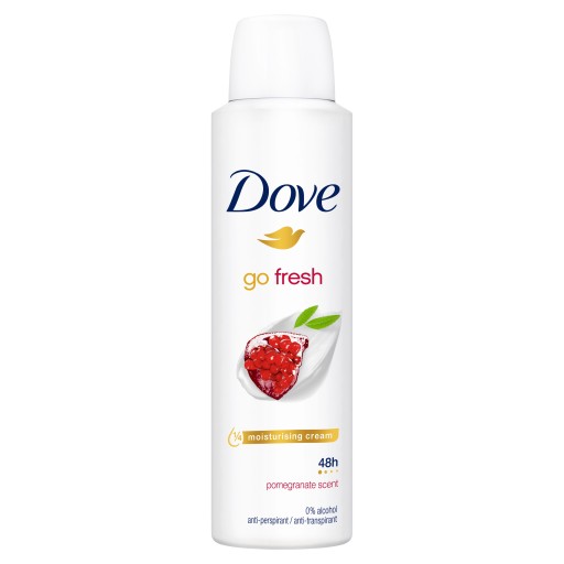 Poza wyjątkowo świeżym zapachem, antyperspirant w aerozolu Dove Go Fresh Pomegranate & Lemon Verbena składa się w ¼ z kremu nawilżającego, który łagodzi podrażnienia po goleniu i nadaje skórze pod pachami miękkość i gładkość już po 3 dniach stosowania.