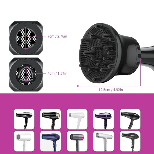 【Uniwersalny】⚡️Otwór dyszy suszarki do włosów z dyfuzorem jest regulowany, średnica dyszy wynosi 4 cm-6,8 cm, którą można regulować na dużym obszarze, pasującym do większości suszarek do włosów. Wyposażony w silikonową podkładkę wewnątrz, jest odporny na zadrapania i antypoślizgowy, co może dobrze chronić suszarkę do włosów.