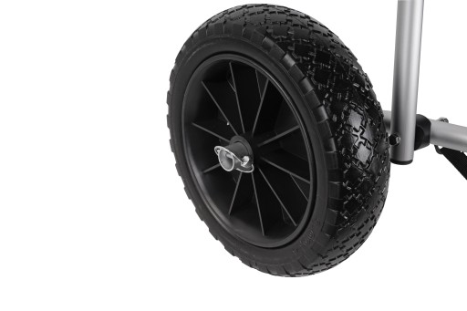 Wózek posiada dwa wytrzymałe gumowe koła i lekką a zarazem solidną konstrukcję z aluminium. Można go łatwo złożyć.