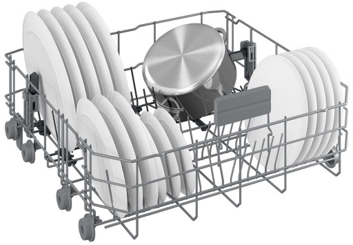 - Górny kosz: trzypoziomowa regulacja kosza, składane elementy, uchwyty na kieliszki, półki na filiżanki, składane kolce