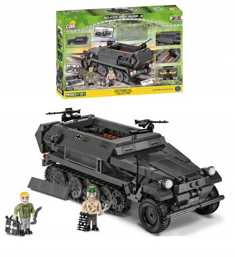Opancerzony półgąsienicowy tansporter jednoznacznie kojarzony przez wszystkich z armią niemiecką. Sd.Kfz 251/1 Ausf.A został wiernie odwzorowany przy użyciu klocków konstrukcyjnych. Model został pokryty wysokiej jakości trwałymi nadrukami. Nadruki imitują oporządzenie oraz malowanie pojazdu z początkowego okresu drugiej wojny światowej. Pojazd został wyposażony w ruchome koła z prawdziwymi oponami. Trakcja gąsienicowa składająca się z realistycznych klockowych ogniw pracuje i zachowuje się jak prawdziwa w trakcie poruszania pojazdem. Schowki, otwierane tylne podwójne drzwi, karabiny maszynowe oraz akcesoria dodatkowe uatrakcyjniają zabawę transporterem. Całość zestawu uzupełniają dwie postacie przedstawiające mechanika i technika. Są to zupełnie nowe wzory figurek uzupełniające kolekcję. Klocek z nazwą pojazdu w zestawie!