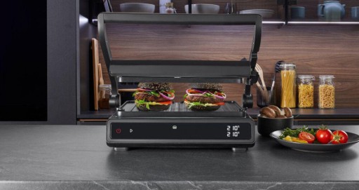 - Funkcje dodatkowe: 11 automatycznych programów grillowania, Antypoślizgowe nóżki, Dwustronna płyta grillowa, Możliwość przechowywania w pionie, Nienagrzewający się uchwyt, Sonda termiczna, Zabezpieczenie przed dziećmi