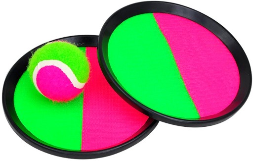 Miękki materiał z rzepem. Średnica rakietki: 18,5 cm. Średnica piłeczki: 6,3 cm. Rozrywka dla dzieci i dorosłych. Dzięki pokryciu paletek rzepem trudniej jest zgubić piłeczkę. Tarcze posiadają regulowany rzep na odwrocie, umożliwia to pewniejsze jej chwycenie.