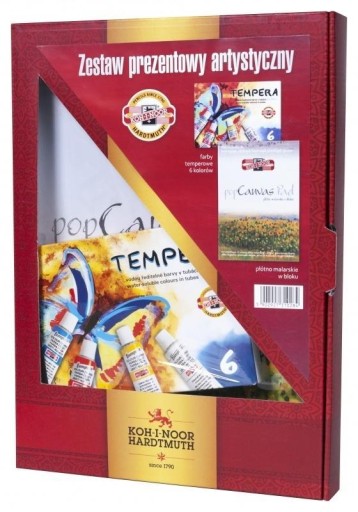 W skład zestawu wchodzą: -farby temperowe (6 kolorów) 162547 -płótno malarskie w bloku