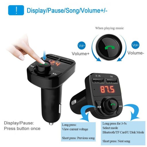 1. Technologia Bluetooth A2DP: Ten samochodowy nadajnik FM Bluetooth może odtwarzać utwory zapisane na dysku U i karcie TF za pośrednictwem technologii Bluetooth A2DP oraz przesyłać dźwięk z telefonu i muzykę stereo do samochodowego zestawu stereo (port 1AUSB do odczytu).
