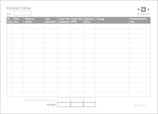 Książka do prowadzenia ewidencji lotów, z rozgraniczeniem lotów swobodnych i PPG. Posiada rubryki do wpisania numeru kolejnego lotu, daty, miejsca startu, typu paralotni, czasu lotu, dystansu, uwag i potwierdzenia lotu. Na osobnych stronach ma roczne zestawienie lotów, a także miejsce do wpisania odbytych szkoleń i zdobytych uprawnień. 100 stron z okładką.