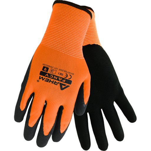 Rękawice ochronne wykonane z poliestrowej dzianiny w kolorze pomarańczowym, powlekane czarnym lateksem o piankowej strukturze ARHEM FANCY