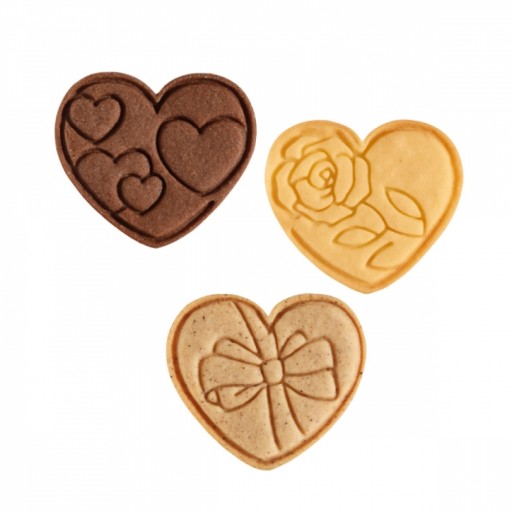 W zestawie znajdują się 3 foremki z tłoczkiem do ciastek w kształcie serduszek z trzema wzorami na pieczątkach: