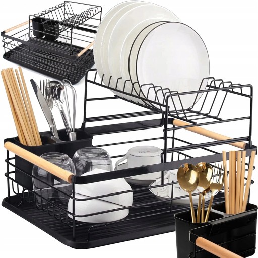 Suszarka do naczyń charakteryzuje się bardzo wysoką jakość i trwałą i metalową konstrukcją. Wykonana z żywicy tacka chroni blat przed zamoczeniem. W zestawie znajduje się również plastikowy, dwukomorowy ociekacz na sztućce. Metalowa czarna suszarka z drewnianymi rączkami jest eleganckim rozwiązaniem do każdej kuchni.