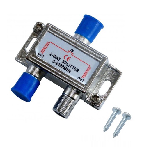 Rozgałęźnik/Splitter do anten (DVB-T, SAT). Pozwoli podłączyć do dwóch telewizorów do jednej anteny. Jego zakres częstotliwości pracy wynosi 5 - 2400 Mhz.