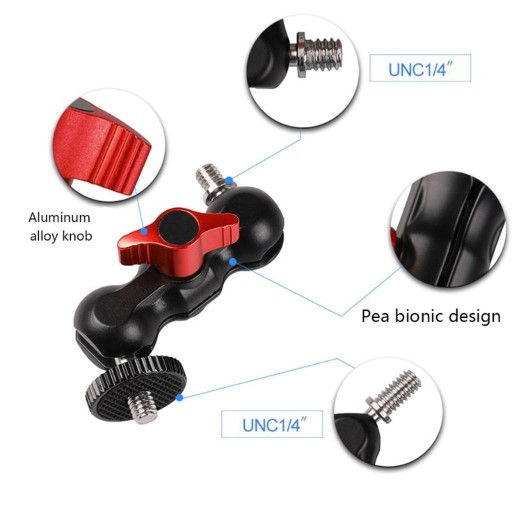Ma żeńskie 1/4 "-20 i 3/8" -16, oba standardowe rozmiary montażowe w przemyśle fotograficznym dla głowicy i statywu mogą być używane do różnych przystawek