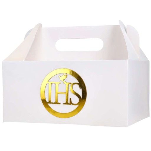 Wyjątkowe pudełka na ciasto w motywie komunijnym. Posiadają one nadruk ze złotym, metalicznym napisem "IHS" w okręgu, wszystko na białym tle, na kartonie który nie przemaka i doskonale zabezpieczy nasz tort na bądź inne przysmaki na czas transportu.