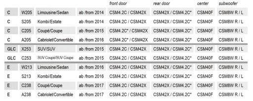 - Montaż: Model CSM8WR jest przeznaczony do montażu po stronie prawej w samochodach MERCEDES-BENZ C, GLC oraz E CLASS.