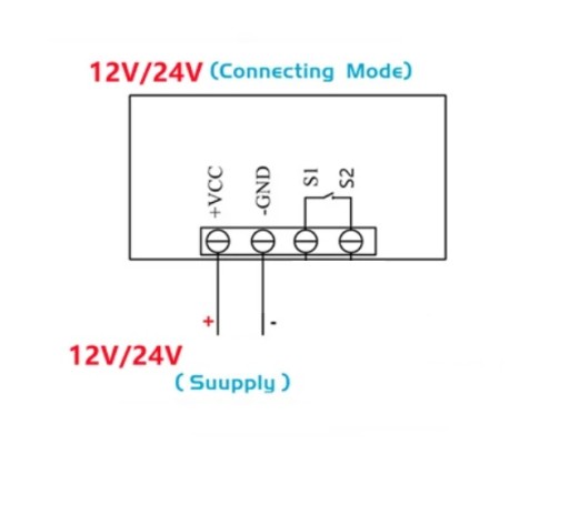 VCC- napięcie zasilania 12V DCGND- masaS1, S2 - styki przekaźnika NO 20A/16V DC 10A/230V AC.