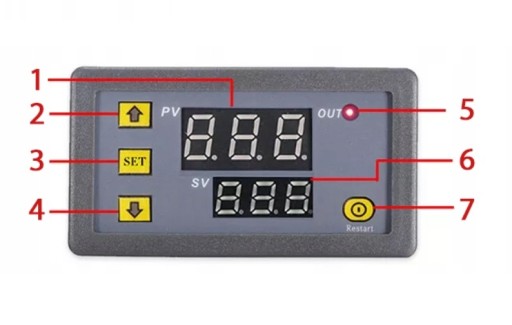 3. Przejdź ponownie do trybu ustawiania parametrów przytrzymując klawisz SET przez 5 sekund. Gdy wyświetla się „P0” na ekranie naciśnij przycisk GÓRA, aby dostosować się do kodu P1 (histereza), a następnie naciśnij przycisk SET, aby uzyskać dostęp do parametru kodu P1. Dostosuj wartość do 5,0 za pomocą przycisków GÓRA/DÓŁ i na koniec naciśnij przycisk RESTART, aby potwierdzić i powrócić do stanu wyświetlania.