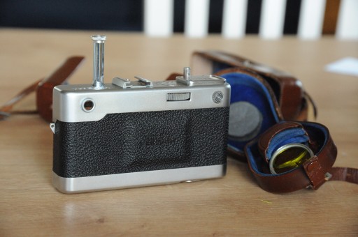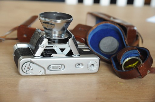 W idealnym stanie wizualnie i sprawny. Wszystkie funkcje działają poprawnie wraz z światłomierzem, plamka dobrze widoczna, szkła obiektywu czyste, żadnych rys, paprochów, osłona przeciwsłoneczna, dwa filtry w futerale, futerał także do aparatu. Czasy długie od 1/4 do 1 są trochę za długie- to wskutek nie używania dawno tych czasów