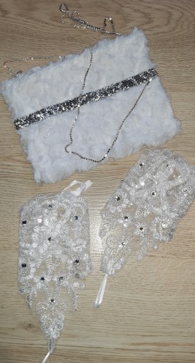 Nowa torebeczka zakładana przez ramię ze ślicznymi błyszczącącymi brylancikami na łańcuszku. Niezapinana. Rekawiczki koronkowe delikatne wiązane na nadgarstku zakładane na jeden palec. W innych ogłoszeniach wianuszki.