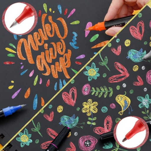 - Wielofunkcyjne metalowe markery: Metaliczne markery z podwójną końcówką mają końcówki włókien, które dobrze pasują do różnych interfejsów pisania, takich jak książki, kartki z życzeniami, ręcznie robiony papier, szkło, drewno, kamienie i tak dalej. Ponadto odwzorowanie kolorów na interfejsie do pisania jest wysokie, a efekt pisania na czarnym lub ciemnym papierze jest lepszy.