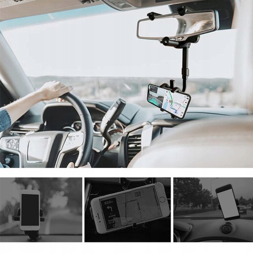 Uniwersalny uchwyt samochodowy do urządzeń mobilnych. Montaż na lusterku wstecznym zapewnia należyty komfortową obsługę telefonu przez kierowcę. Możliwość pełnej regulacji kąta nachylenia telefonu w płaszczyźnie 360 stopni umożliwia jego ustawienie tak, aby wyświetlacz był doskonale widoczny. Wygodne regulowane ramię dodatkowo zwiększa komfort użytkowania. Kompatybilny ze wszystkimi standardowymi smartfonami oraz tabletami.