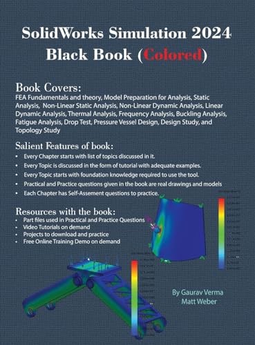 The SolidWorks Simulation 2024 Black Book, is 11th edition of the book written to help professionals as well as students in performing various tedious jobs of Finite Element Analysis. The book follows a step-by-step methodology. This book explains the background work running behind your simulation analysis screen. The book covers almost all the information required by a learner to master the SolidWorks Simulation. The book starts with basics of FEA, goes through all the simulation tools and ends up with practical examples of analysis. Chapters on manual FEA ensure the firm understanding of FEA concepts through SolidWorks Simulation. The book contains our special sections named `Why?` and notes. We have given reasons for selecting most of the options in analysis under the `Why?` sections. The book explains the Solver selection, iteration methods like Newton-Raphson method and integration techniques used by SolidWorks Simulation for functioning. A chapter on Topology Study helps you understand the procedures of modifying component based on analysis results. New tips and notes have been added in this book for various analyses. Some of the salient features of this book are: In-Depth explanation of conceptsEvery new topic of this book starts with the explanation of the basic concepts. In this way, the user becomes capable of relating the things with real world. Topics CoveredEvery chapter starts with a list of topics being covered in that chapter. In this way, the user can easily find the topic of his/her interest easily. Instruction through illustrationThe instructions to perform any action are provided by maximum number of illustrations so that the user can perform the actions discussed in the book easily and effectively. There are about 750 illustrations that make the learning process effective. Tutorial point of viewThe book explains the concepts through the tutorial to make the understanding of users firm and long lasting. Each chapter of the boo [...]