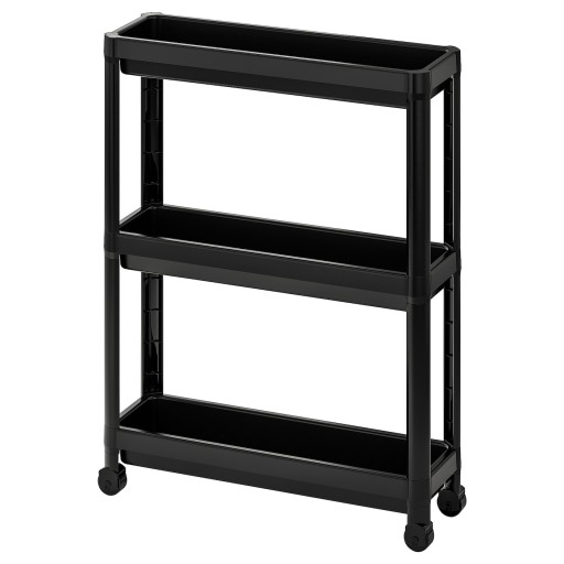 VESKEN Wózek - czarny 54x18x71 cm to praktyczne rozwiązanie do małych łazienek, które pozwoli Ci na efektywne przechowywanie i organizację przyborów toaletowych. Dzięki solidnej konstrukcji i czterem kółkom, wózek jest łatwy w przemieszczaniu, a jego niewielkie rozmiary sprawiają, że zmieści się nawet w ciasnych przestrzeniach.