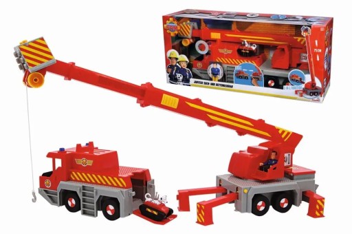 Duży żuraw strażacki z popularnej serii Strażak Sam. Długość samochodu wynosi 50 cm, długość ruchomego ramienia wynosi 75 cm. Zestaw zawiera figurkę Strażaka Sama.