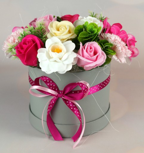Bukiet wykonany w flower boxie ze wstążką, wysokiej jakości kwiatów mydlanych i dodatków sztucznych.