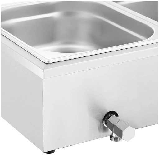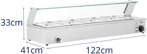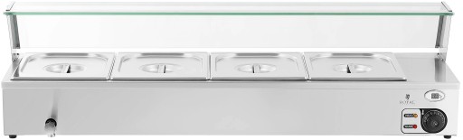 Bemar gastronomiczny marki Royal Catering sprawdzi się w restauracjach, bufetach, na stołówkach czy w barach do utrzymywania w cieple żywności. Urządzenie posiada moc 2000 W. Regulacja temperatury następuje w zakresie 30-110°C. Bemar działa na zasadzie konwekcji, element grzewczy podgrzewa wodę znajdującą się pomiędzy urządzeniem a pojemnikami GN i przekazuje ciepło do pojemników, bez ryzyka przypalenia. Duża pojemność 4 x GN 1/2 (4 x 4,7 l) pozwala na podgrzanie kilku różnych dań w jednym czasie. W urządzeniu można zastosować inne rozmiary pojemników GN i je połączyć ze sobą. Bemar wykonany został ze stali nierdzewnej, jest wytrzymały, odporny na korozję i higieniczny. Kranik spustowy ułatwia opróżnianie i czyszczenie urządzenia. Osłona z hartowanego szkła chroni żywność przed zabrudzeniem. Gumowe nóżki zapewniają stabilność i nie rysują podłoża.