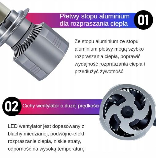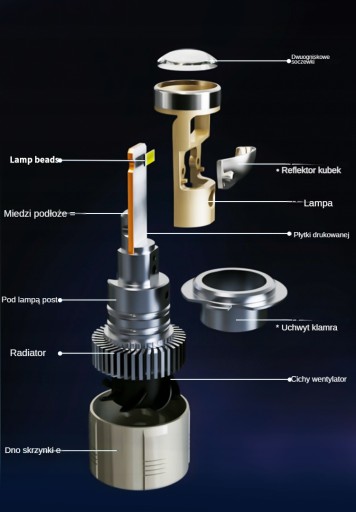 - Inteligentny, sterowany chipem dwustopniowy system chłodzenia z radiatorem, wysoka wydajność, brak zakłóceń radia FM/CB oraz brak efektu wypalania się jak w przypadku żarników ksenon i tradycyjnych żarówek halogenowych.