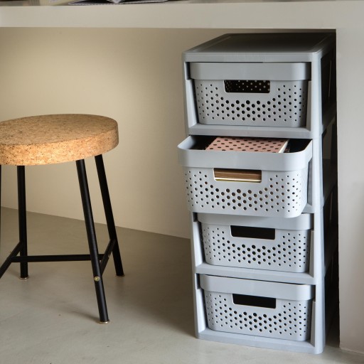Prosty sposób na uporządkowanie domowych akcesoriów - niech wszystkie drobiazgi wreszcie znajdą swoje stałe miejsce! Regał wyposażony jest w cztery pojemne szuflady z wygodnymi uchwytami.