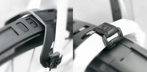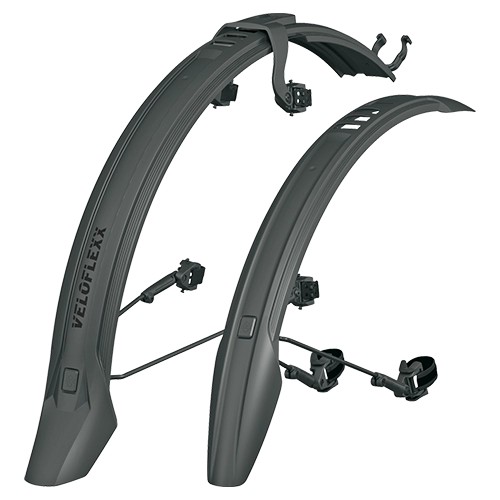 Zestaw błotników VELOFLEXX 55 wykonany z odpornego na uderzenia, wysokowydajnego tworzywa sztucznego łączy w sobie stabilność stałego błotnika z elastycznością błotnika zatrzaskowego. Dzięki mostkowi VELOFLEXX osłonę tylnego koła można przymocować do górnej części wspornika siodełka za pomocą gumowych pasków bez użycia narzędzi.
