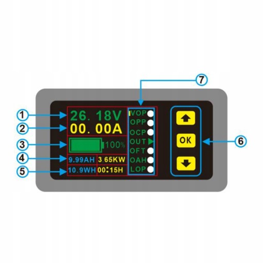 Po wyłączeniu funkcji pamięci, wyłącz liczbę AH, wygodnie jest obserwować i mierzyć liczbę AH i funkcję resetowania prądu, nie mają wpływu na następny pomiarNapięcie, prąd, pojemność ładowania AH, WH, , potęga pokaże się w tym samym czasie, również wszystkie informacje