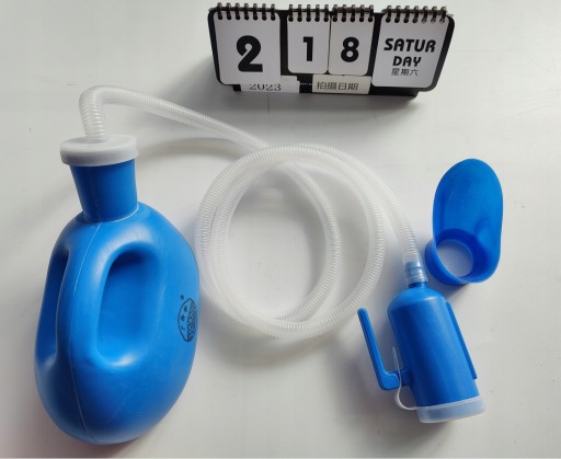 Parametry: Materiał: tworzywo sztuczne Rozmiar: 2000 ml Kolor: biały niebieski Lista opakowań: Pisuar*1 Długa rurka*1 Złączka dla pań*1