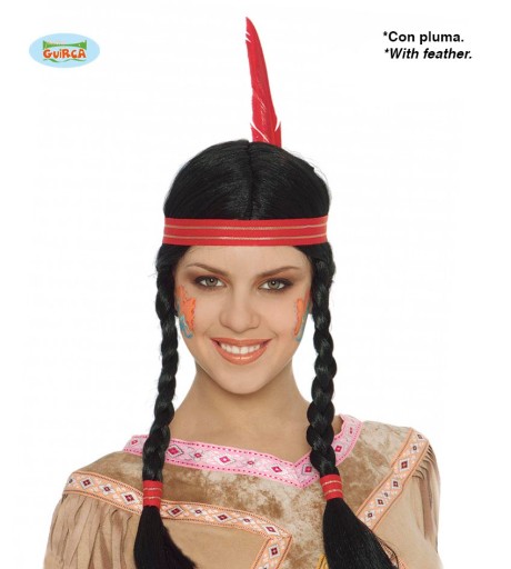 - Peruka Indiańska z warkoczami, z opaską i piórkiem wykonana z włosów sztucznych, idealny dodatek do stroju Indianina i Indianki.