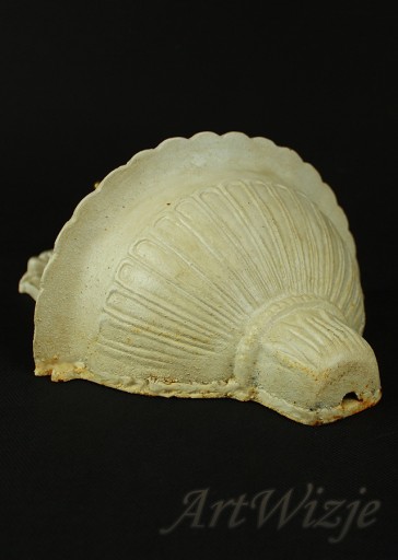 Beżowa żeliwna wylewka (zlew) z kranem zdobiona motywami roślinnymi.