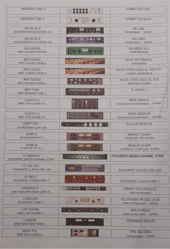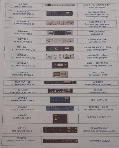 Focusrite Liquid MIX – to nie jest zwykłe rozszerzenia dla DSP… to nie są zwykłe pluginy, zastosowanie technologii splotowej, czyli pobrano próbki, (coś na wzór znanego Kamper Amps ,a większość z nas wie co to za sprzęt i jak brzmi ) więc z rzeczywistych kompresorów, EQ oraz consoli miksujących wsadzili do niewielkiej obudowy, z pełną kontrolą każdego urządzenia, możliwość zapisu własnych ustawień na każdym z nich, możliwość zapisu pod własną nazwą . Konsekwencja zastosowania tych wirtualnych urządzeń jest totalnie zaskakująca w porównaniu z pluginami wirtualnymi i systemowymi. Focusrit nie mógł wypuścić swojej technologii z nazwami oryginalnych urządzeń z których pobrali próbki, więc zatytułowali je po swojemu. Na fotkach które dodałem są odnośniki tych sprzętów z jakich zostały pobrane próbki . W lewej kolumnie nazwa Focusrit, po prawej dawca próbek. (sukcesywnie będę dodawał sprzęt po likwidacji studia )