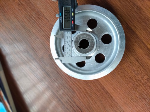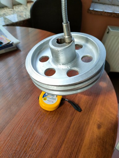 średnica koła 165 mm , głębokość piasty ok 49mm .Koło wykonane z aluminium z wtopioną piastą stalową /osadczą na wałek /, na zdjęciu pokazałem że uniosłem magnesem za piastę . Ciężar całości 1030 g.
