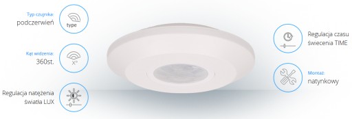 Małogabarytowy, ultra płaski czujnik, służy do automatycznego sterowania oświetleniem lub innymi urządzeniami elektrycznymi. Potencjometry do regulacji: czasu świecenia i czułości natężenia światła. Czujnik współpracuje z oświetleniem LED-owym.