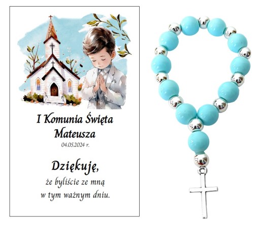 PAMIĄTKA UPOMINEK PREZENT PODARUNEK DLA GOŚCI Z OKAZJI KOMUNII ŚWIĘTEJ - KARTECZKA Z PODZIĘKOWANIEM I DZIESIĄTKĄ RÓŻAŃCA
