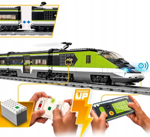 Zestaw LEGO® City Ekspresowy pociąg pasażerski (60337) zawiera zdalnie sterowaną lokomotywę z działającymi, ściemnianymi przednimi reflektorami i technologią Powered Up, wagon restauracyjny, wagon pasażerski, peron, 24 elementy torów kolejowych i sześć minifigurek do nieograniczonej zabawy w odgrywanie ról.