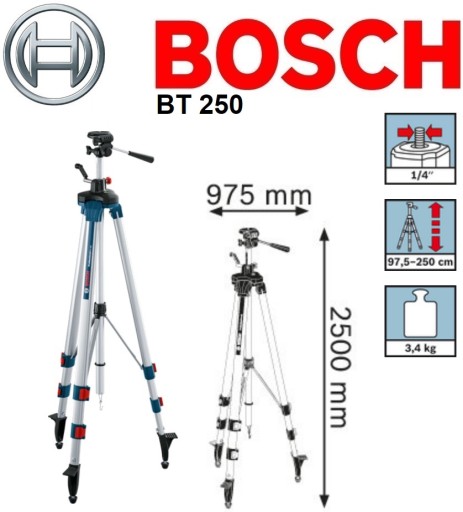 Statyw Bosch BT 250 to profesjonalne urządzenie przeznaczone do montażu laserów. Zapewnia absolutną stabilność laserów liniowych i krzyżowych na każdym rodzaju podłoża.