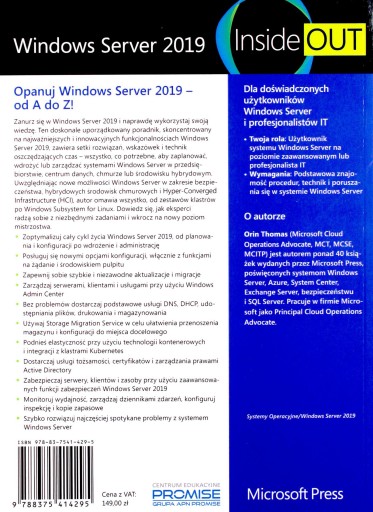 Opanuj Windows Server 2019 ? od A do Z Użytkownik systemu Windows Server na poziomie zaawansowanym lub profesjonalista IT Wymagania: Podstawowa znajomość procedur, technik i poruszania się w systemie Windows Server O autorze Orin Thomas (Microsoft Cloud Operations Advocate, MCT, MCSE, MCITP) jest autorem ponad 40 książek wydanych przez Microsoft Press, poświęconych systemom Windows Server, Azure, System Center, Exchange Server, bezpieczeństwu i SQL Server. Pracuje w firmie Microsoft jako Principal Cloud Operations Advocate. Wyczerpujący, kompletny poradnik Setki rozwiązań oszczędzających czas Doskonale uporządkowany i wypełniony eksperckimi wskazówkami