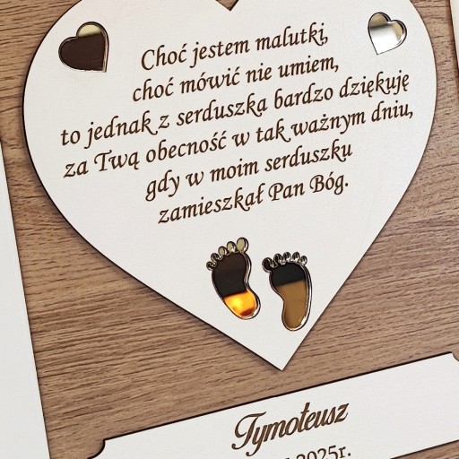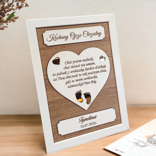 Ta wyjątkowa ramka została starannie wykonana aby podkreślić znaczenie tego dnia chrztu. Z jej pomocą możesz przekazać swoje najszczersze słowa wdzięczności i miłości, które będą wyrażeniem uznania dla zaangażowania Matki Chrzestnej i Ojca Chrzestnego w życie dziecka.