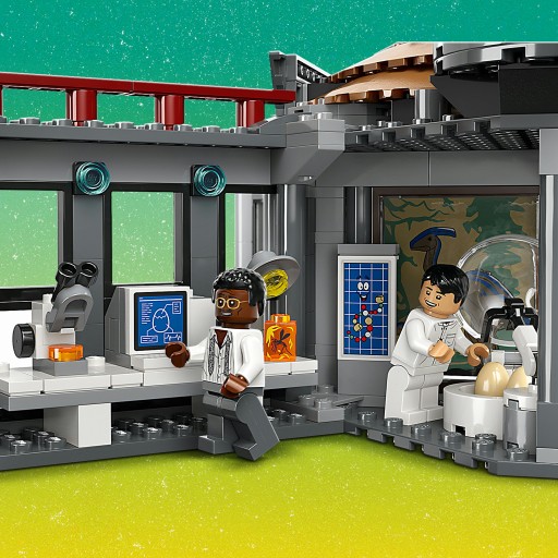 Przeżyj ponownie dramatyczne sceny z Parku Jurajskiego dzięki zestawowi Centrum dla odwiedzających: atak tyranozaura i raptora (76961) dla dzieci w wieku od 12 lat. Charakterystyczna architektura Centrum dla odwiedzających została przedstawiona w stylu LEGO, a hol wejściowy, kuchnia z jadalnią i laboratorium są przedzielone półprzezroczystymi ekranami z grafikami dinozaurów. Umieść szkielet tyranozaura do zbudowania w holu wejściowym i spraw, by transparent z napisem When dinosaurs ruled theEarth (Kiedy dinozaury rządziły Ziemią) spadł, po przesunięciu dźwigni, podczas walki między ruchomymi figurkami tyranozaura i welociraptora.