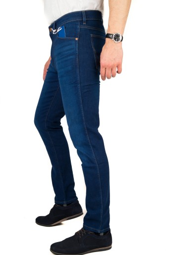 Jeansy firmy Wrangler model Larston charakteryzują się dopasowanym fasonem z nogawką typu slim i niskim stanem. Zapięcie na zamek oraz metalowy, sygnowany guzik. Kieszenie nitowane. Materiał z dodatkiem streczu co sprawia, że są komfortowe i przyjemne w noszeniu. Spodnie te można nosić w dwóch wersjach: sportowej i dopasowany do bardziej eleganckich dodatków. Z tyłu, na pasku skórzana naszywka z logo.