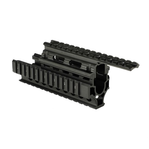 Taktyczne łoże z osłoną tchawicy do karabinków szturmowych serii AK oraz ich modyfikacji. Wykonany z anodyzowanego aluminium. Szyna taktyczna w standardzie RIS (20 mm) znajduje się na wszystkich czterech powierzchniach, umożliwiając podłączenie uchwytów taktycznych, latarek, lunet i wszelkich innych urządzeń kompatybilnych z RIS.
