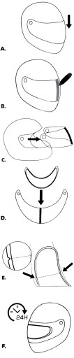 Odklej folię FogCity® od ochronnej folii transportowej. Złóż delikatnie folię anti-fog w kształt przypominający literę "U". Trzymaj przy tym folie za jej krawędź nie dotykając powierzchni po stronie kleju. Podczas tego kroku skieruj część samoprzylepną folii w kierunku wizjera, na którym ma być zamontowana (rysunek D na obrazie po lewej).