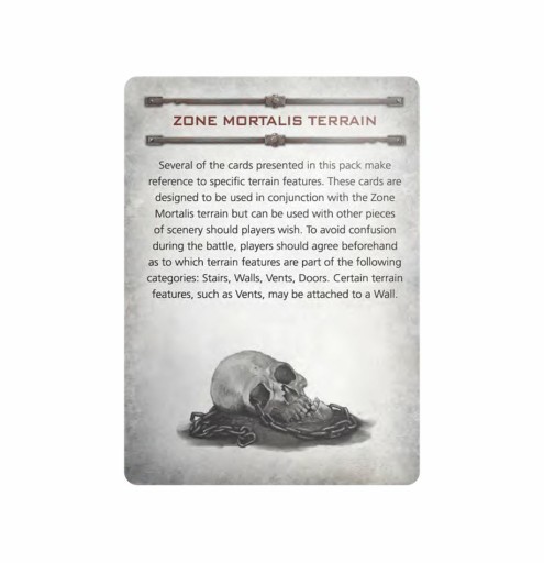 – 1x Dwustronna karta zasad, oferująca nową opcjonalną zasadę korzystania ze schodów Zone Mortalis i dalsze instrukcje dotyczące korzystania z tego zestawu kart